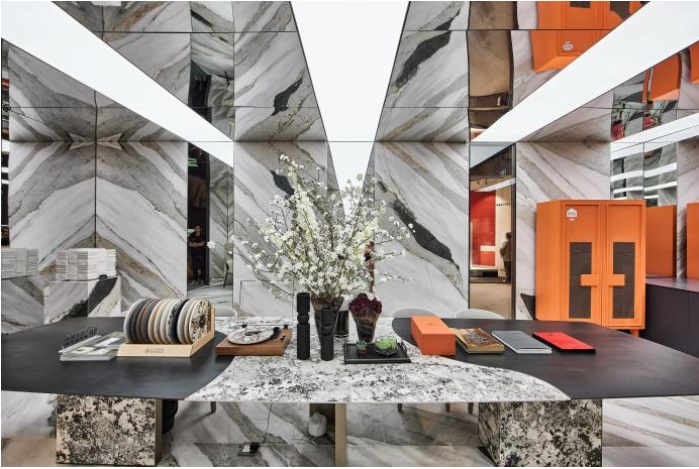 奧卓斯巖板:以其標(biāo)志性獨(dú)特紋理巖板塑造展位的立面和地板,結(jié)合鏡面與光膜的組合運(yùn)用,極致放大空間的張力與未來感。精塑的空間家具與定制工藝藝術(shù)品,生動闡述品牌產(chǎn)品超越傳統(tǒng)的多場景應(yīng)用可能性和對極致工藝的不懈追求。