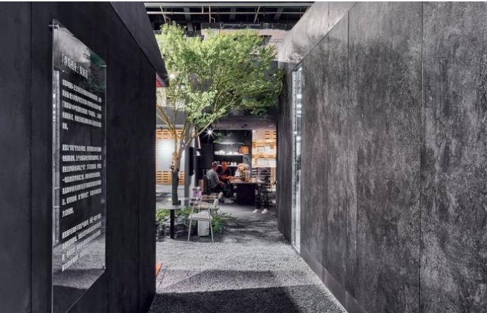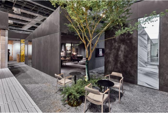 五個品牌“浮島”之間,由公共區(qū)域無縫連接,是同等展位中規(guī)模最大的公共區(qū)域。地面采用天然沙石全鋪,配以4米多高的綠植樹木,營造出“浮島”特有的自然野趣與松弛氛圍,讓參觀者仿佛置身戶外,在悠然漫步中感受空間傳遞的環(huán)保與可持續(xù)理念。