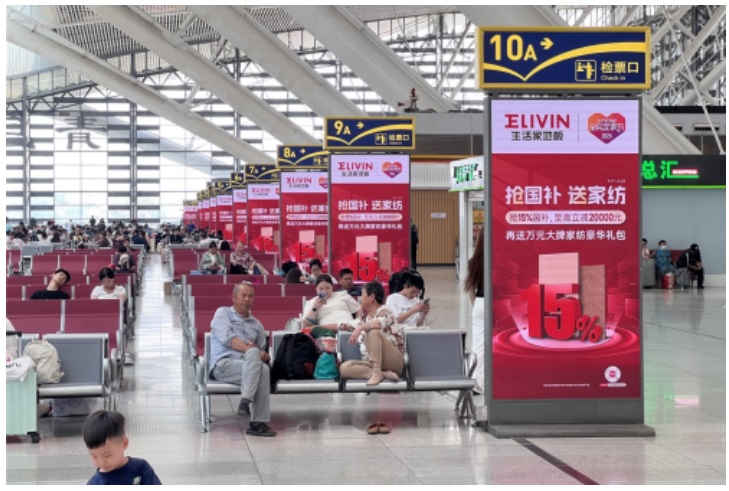 活動(dòng)期間,生活家地板促銷廣告強(qiáng)勢登陸全國 60 個(gè)高鐵站的 983 塊大屏,高鐵大屏廣告以其強(qiáng)大的視覺沖擊力和廣泛的覆蓋范圍,為全民戀家節(jié)活動(dòng)的出圈提供了強(qiáng)大的支持,讓促銷活動(dòng)政策在億萬旅人的歸途與遠(yuǎn)行中被反復(fù)看見、深刻銘記,實(shí)現(xiàn)了品牌信息的有效觸達(dá)。
