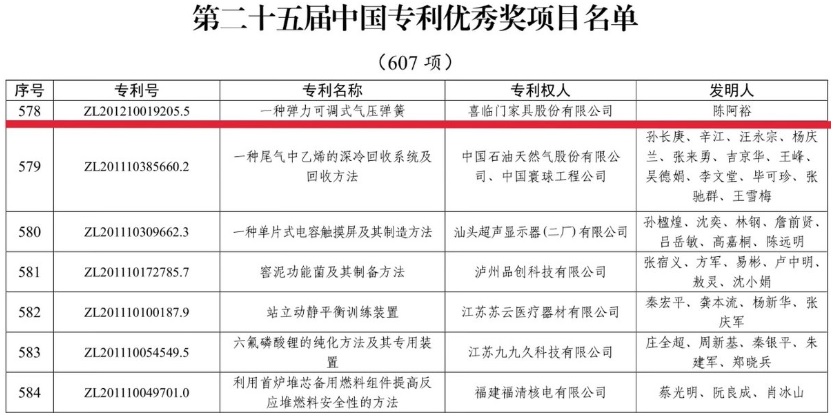 6月5日,國(guó)家知識(shí)產(chǎn)權(quán)局公布第二十五屆中國(guó)專利獎(jiǎng)授獎(jiǎng)決定,在本屆769項(xiàng)中國(guó)專利獎(jiǎng)獲獎(jiǎng)名單中,科技睡眠企業(yè)喜臨門(603008.SH)憑借“一種彈力可調(diào)式氣壓彈簧”(ZL201210019205.5)榮獲中國(guó)專利優(yōu)秀獎(jiǎng)。