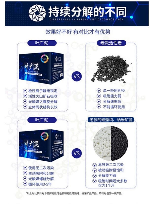 葉廣泥和活性炭不一樣,活性炭只能吸附,用一段時間以后吸附會飽和,葉廣泥不僅僅是吸附,是吸附后可以分解有害物質(zhì),不會再釋放,不需要暴曬,可以持久分解,使用3年。