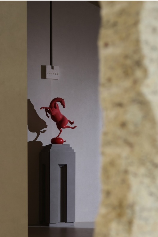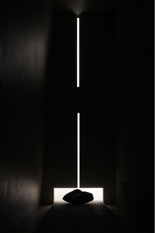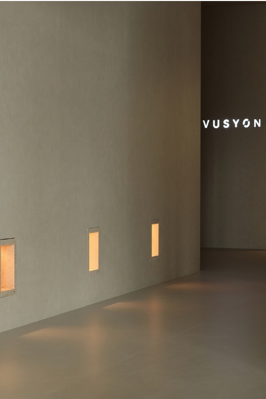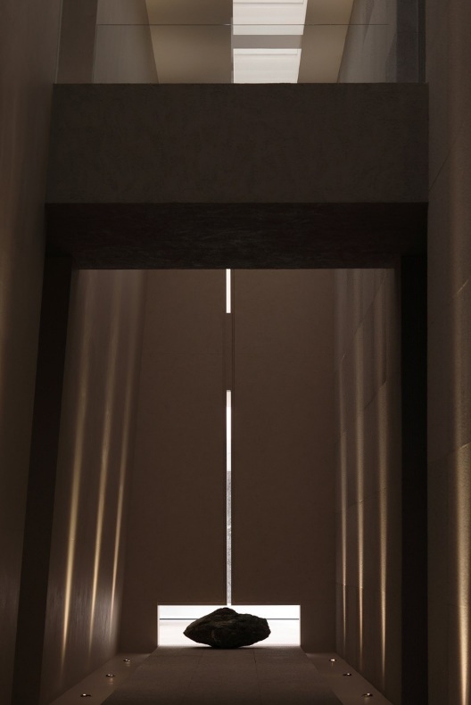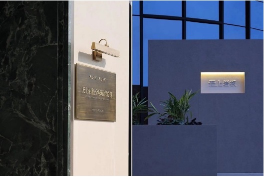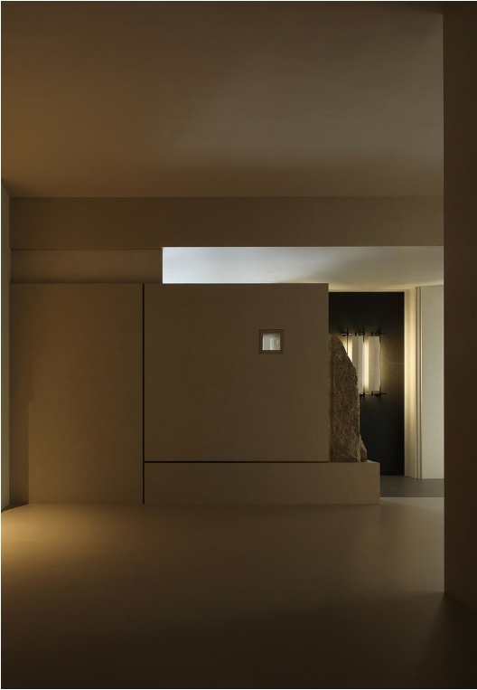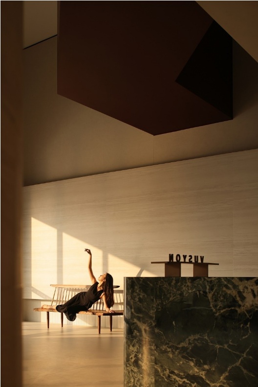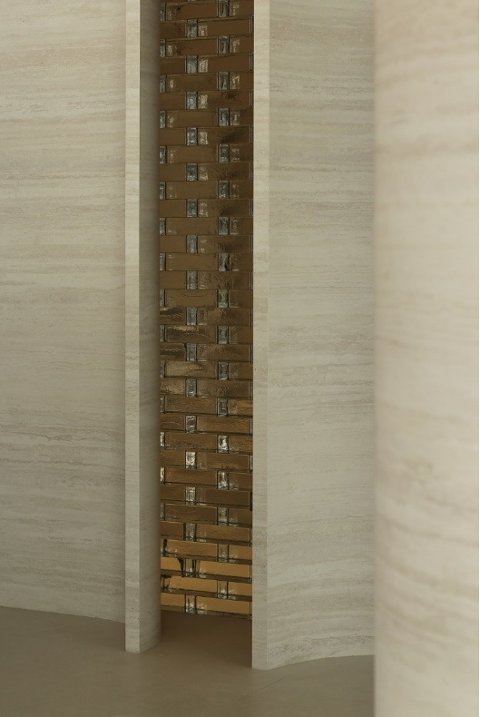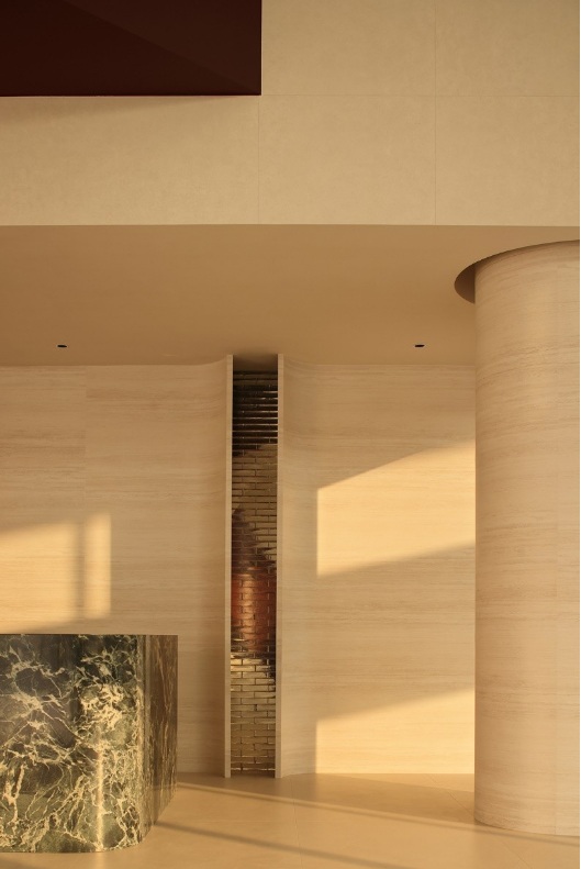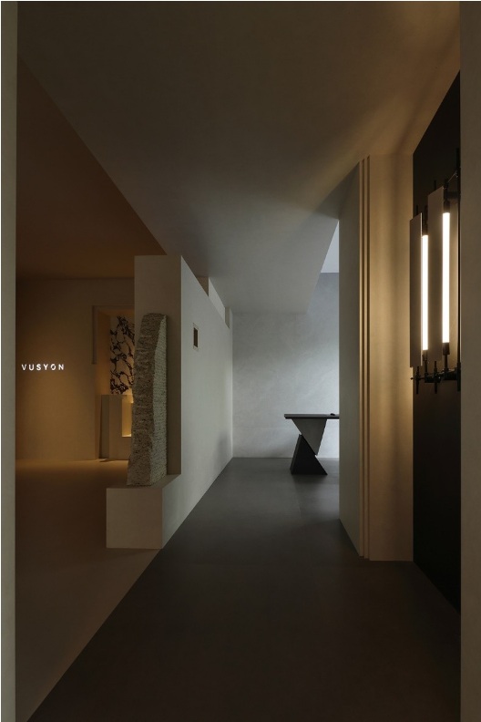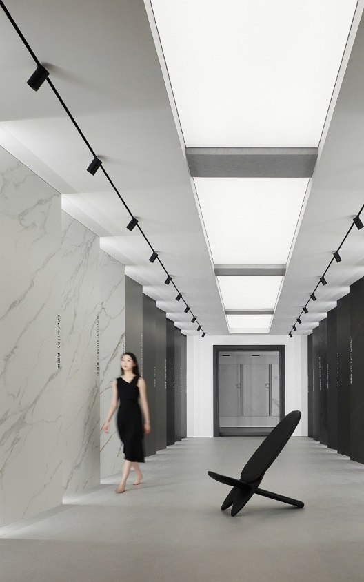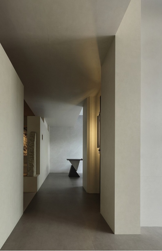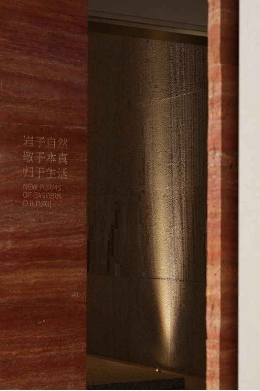 入口左側(cè)墻體由下往上傾斜,采用巖板材質(zhì),右側(cè)采用大理石拉槽處理,巖板向大理石致敬。借助層高7米的優(yōu)勢塑造了靜謐而深遠(yuǎn)的峽谷意向,頂部天光令立面變得柔和有度?臻g呈現(xiàn)多維度的博物館場景體驗(yàn)。兩邊材質(zhì)通過燈光引導(dǎo)訪客順氣前行,進(jìn)而開啟光的序幕。