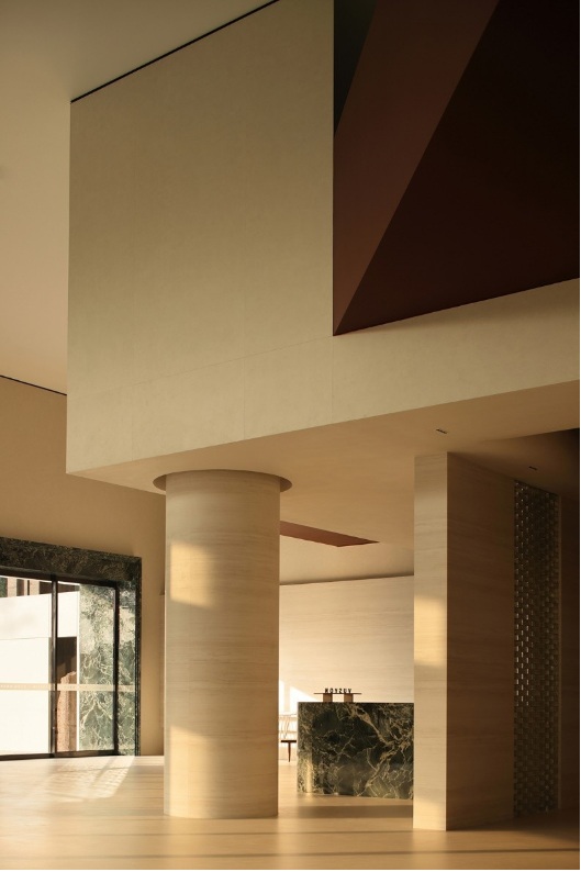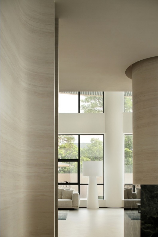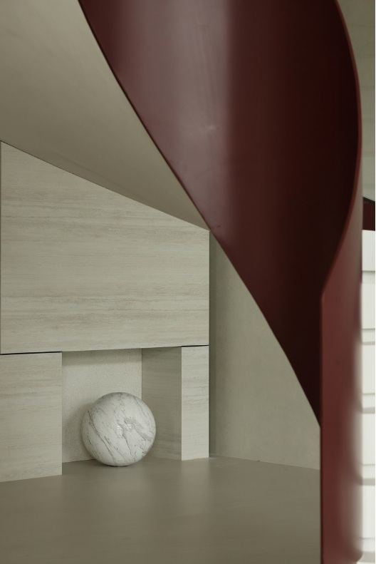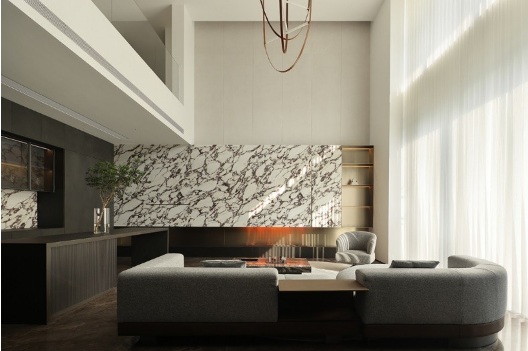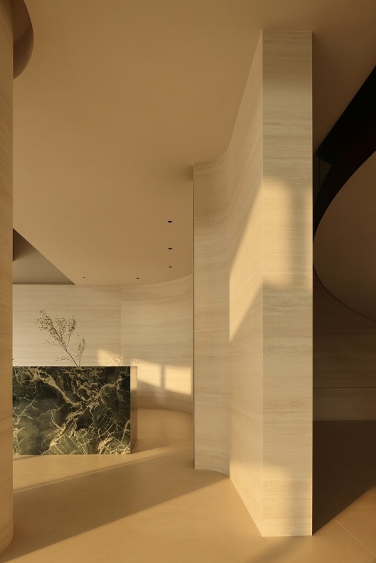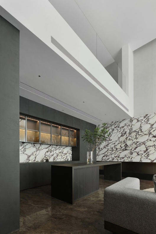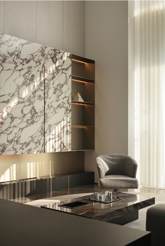 大理石經(jīng)過風(fēng)雨過后留下的痕跡結(jié)合巖板融入空間,增添空間立體感和趣味性,呈現(xiàn)出多維度的場景。