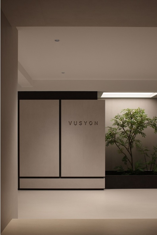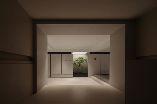 通道入口通過樸實(shí)無華的物理形態(tài)創(chuàng)造出安靜的氛圍,營造出未來感的寧靜,融合了技術(shù)空間和建筑手法,植物造景三面通透。