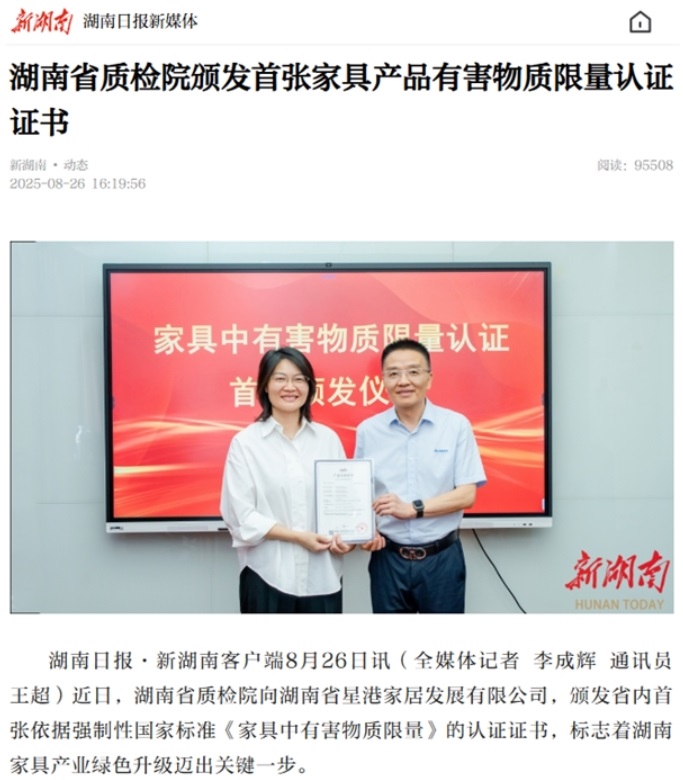 近日,湖南省產(chǎn)商品質(zhì)量檢驗(yàn)研究院、湖南日?qǐng)?bào)先后發(fā)布消息,湖南省首張基于強(qiáng)制性國(guó)家標(biāo)準(zhǔn)GB 18584-2024《家具中有害物質(zhì)限量》的認(rèn)證證書(shū)被頒發(fā)給湖南星港家居。