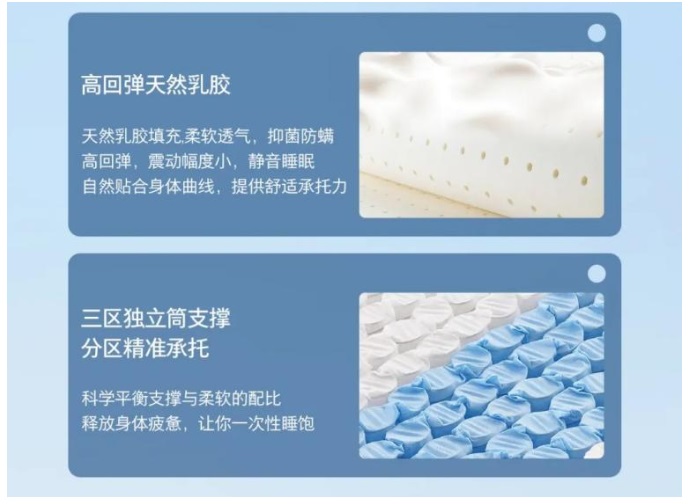 作為一張符合人體工學(xué)的智能床,星舟1號Pro創(chuàng)新設(shè)計三區(qū)獨立筒系統(tǒng),針對肩頸、腰部和腿部三大關(guān)鍵區(qū)域,分別提供舒柔放松、強韌支撐和舒柔放松的差異化承托,確保脊柱在整夜安眠中始終維持自然的S曲線。同時以天然乳膠搭配凝膠的材質(zhì)組合增大回彈力與貼合性,使床墊更契合人體曲線,深度緩解肌肉壓力。