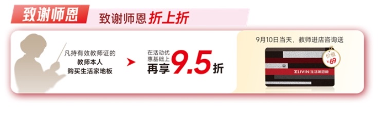2025年9月1日—10月8日活動期間,凡持有效教師證的教師本人,前往生活家地板全國專賣店購買地板,可在活動優(yōu)惠基礎(chǔ)上再享額外 9.5 折優(yōu)惠。另外在9月10日教師節(jié)當天,教師本人進店即可獲得生活家精美地墊一份,讓廣大教師感受到節(jié)日的溫暖與關(guān)懷。