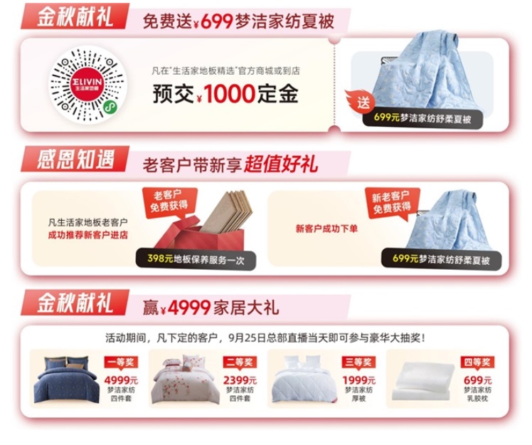 在這特別的金秋時節(jié),生活家地板通過線上線下融合的消費場景,為消費者提供一站式豐富多元的購物體驗。如預(yù)交定金免費送夢潔家紡舒柔夏被;老客戶推薦新客戶,新老客戶共享實惠;地板下定成功參與豪華抽獎,4999元好禮隨機送......各項貼心的福利政策和豐厚的獎品,吸引了眾多消費者的關(guān)注和參與。