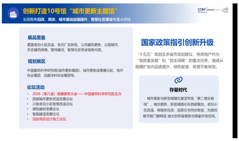 城市更新已成為驅(qū)動城市可持續(xù)發(fā)展的核心引擎。川渝地區(qū)存量房市場規(guī)模突破10億平方米,舊改、局改政策持續(xù)落地,釋放出巨大市場潛力。2026中國成都建博會精準把握這一戰(zhàn)略機遇,傾力打造10號館城市更新主題館,聚焦舊城改造、局部更新、城市基礎(chǔ)設(shè)施提升、智慧社區(qū)建設(shè)四大核心領(lǐng)域,為產(chǎn)業(yè)鏈上下游企業(yè)搭建起對接中西部市場的專業(yè)橋梁。