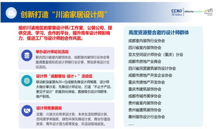 展會還將攜手新浪家居及20余位成都先鋒設(shè)計師聯(lián)合策展,通過設(shè)計師大咖分享沙龍、先鋒設(shè)計師論壇等活動,打造“不止于產(chǎn)品,更見于設(shè)計”的差異化體驗,精準吸引設(shè)計師群體與優(yōu)質(zhì)客戶到場交流。設(shè)計周特設(shè)新材料、新工藝區(qū)、創(chuàng)意概念區(qū)、設(shè)計師作品區(qū)三大特色展區(qū),全方位展現(xiàn)行業(yè)前沿趨勢與設(shè)計落地成果,F(xiàn)場還將頒發(fā)“川渝文化傳承”“未來生活創(chuàng)想”“空間美學卓越”等六大獎項,表彰行業(yè)精英,激發(fā)創(chuàng)新活力。