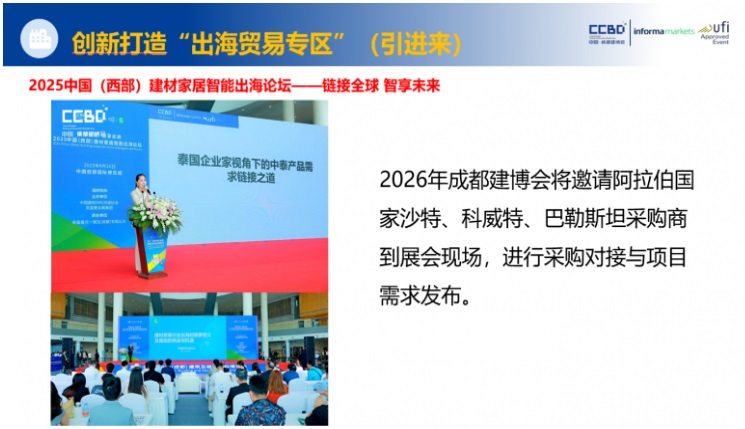 國家“一帶一路”倡議持續(xù)推進,為企業(yè)出海貿(mào)易注入強勁動力。2025年一季度,我國貨物貿(mào)易進出口總值同比增長1.3%,企業(yè)“走出去”的需求愈發(fā)迫切。2026中國成都建博會順勢而為,創(chuàng)新打造出海貿(mào)易專區(qū),并舉辦系列出海論壇活動,搭建中國企業(yè)與國際市場的高效對接橋梁。