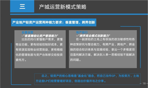 產(chǎn)城業(yè)務(wù)也有兩種運(yùn)作的方法,一是全景運(yùn)營(yíng),這是我們提出來的一種新理念,也就是說把產(chǎn)城項(xiàng)目垂直精細(xì)化的資產(chǎn)管理能力發(fā)揮到淋漓盡致。這就要求我們產(chǎn)城運(yùn)營(yíng)商要非常了解客戶的需求,以及項(xiàng)目本身所承載的功能,使項(xiàng)目通過非常精細(xì)化的投資、建設(shè)、運(yùn)營(yíng)管理獲得專業(yè)能力帶來的收益與溢價(jià)。二是地產(chǎn)投行,就是跨界商業(yè)模式的創(chuàng)新能力。也就是說在產(chǎn)城項(xiàng)目上,我們能夠跨產(chǎn)業(yè)、跨地產(chǎn)、跨金融尋找出一個(gè)新的解決方案,能夠使政府、入園企業(yè)、投資商、以及我們運(yùn)營(yíng)商能夠拿到大家都想得到的合理的收益。這種商業(yè)模式其實(shí)是最難的、最高的但是收益也是最大的。