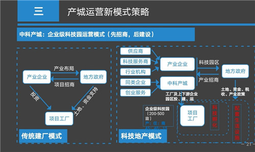 中科產(chǎn)城公司的客戶,一類是企業(yè)級(jí)客戶,一類是政府平臺(tái)類客戶。企業(yè)級(jí)客戶就是產(chǎn)業(yè)內(nèi)優(yōu)秀的大咖企業(yè),幫他們與地方政府洽談做企業(yè)級(jí)科技園,幫企業(yè)產(chǎn)業(yè)項(xiàng)目落地。同時(shí)圍繞企業(yè)的上下游產(chǎn)業(yè)鏈整合一個(gè)新的科技孵化器及科技園區(qū),在為這些工廠和孵化器的從業(yè)人員提供配套的公寓、住宅、商業(yè)等城市功能服務(wù)。
