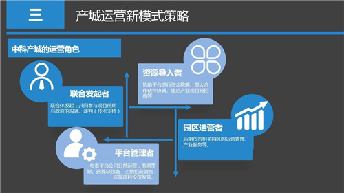 那么總體來講,中科產(chǎn)城公司作為產(chǎn)城開發(fā)與運(yùn)營(yíng)的實(shí)踐者,我們將在產(chǎn)城項(xiàng)目全景運(yùn)營(yíng)過程中發(fā)揮四個(gè)主要角色:一個(gè)聯(lián)合發(fā)起者,是作為項(xiàng)目的聯(lián)合發(fā)起者參與前期的策劃、規(guī)劃,與政府及各方就投資與商務(wù)條件達(dá)成共識(shí)。二是資源導(dǎo)入者,將投資資金、產(chǎn)業(yè)項(xiàng)目、土地資源、配套政策等重要資源協(xié)調(diào)、導(dǎo)入到投資平臺(tái)內(nèi)。三是平臺(tái)管理者,以委托運(yùn)營(yíng)或者"小股操盤"的方式承接主要投資方的委托,負(fù)責(zé)投資平臺(tái)的日常開發(fā)、運(yùn)營(yíng)事務(wù),為各方實(shí)現(xiàn)產(chǎn)城項(xiàng)目預(yù)期收益。四是園區(qū)運(yùn)營(yíng)者,作為產(chǎn)業(yè)園區(qū)專業(yè)的全景運(yùn)營(yíng)機(jī)構(gòu),可以受投資平臺(tái)的專項(xiàng)委托僅對(duì)產(chǎn)城項(xiàng)目中最具挑戰(zhàn)的產(chǎn)業(yè)園區(qū)部分進(jìn)行管理服務(wù)。
